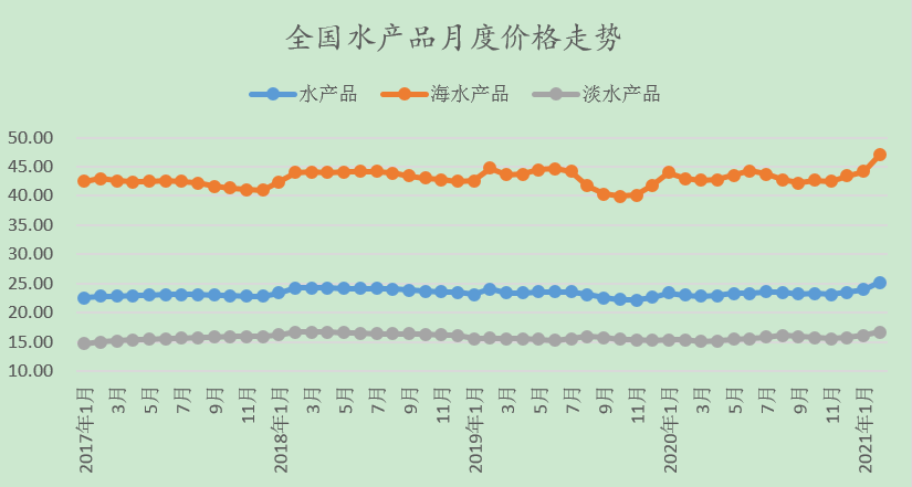 2月份,海水產(chǎn)品價(jià)格47.03元/公斤,環(huán)比上漲6.37%,同比上漲9.49%。